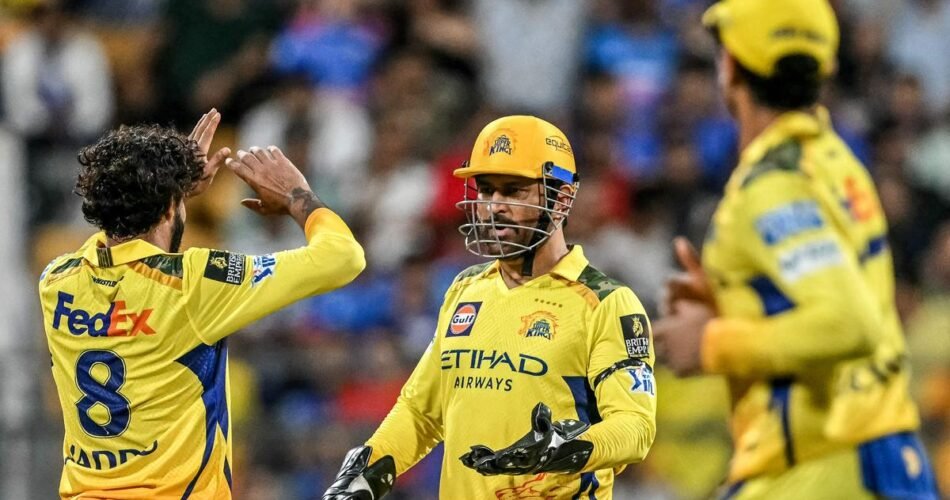 The picture shows Chennai Super Kings’ Ravindra Jadeja celebrating with captain MS Dhoni after taking the wicket of Ryan Rickelton. The image captures the moment of victory and teamwork between the two players. The joy and enthusiasm on their faces are evident as they celebrate the successful dismissal of the opposition player.
