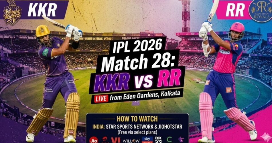 The 28th match of the Indian Premier League 2026 will take place at the iconic Eden Gardens in Kolkata. The winless Kolkata Knight Riders will face the high-flying Rajasthan Royals on April 19 in a crucial match to stay relevant in the tournament. KKR, led by Ajinkya Rahane, is yet to secure a win this season and will rely on Vaibhav Sooryavanshi to make an impact. On the other hand, Rajasthan Royals, captained by Riyan Parag, aim to reclaim the top spot with the help of Yashasvi Jaiswal and Jofra Archer. In India, Star Sports Network is the official TV broadcaster for the match, offering coverage in multiple languages. Viewers can also watch the match for free using telecom offers such as those from Reliance Jio and Airtel. Fans around the world can live stream the match through platforms like Willow TV, Sky Sports Cricket, Fox Cricket, and more, depending on their location.