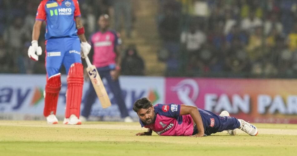 In this image, we see DC’s KL Rahul observing as RR’s Sandeep Sharma attempts to field the ball during the Indian Premier League 2025 cricket match between Rajasthan Royals (RR) and Delhi Capitals (DC) at Arun Jaitley Stadium in New Delhi on Wednesday, April 16, 2025. The intensity and focus of the players are evident as they compete in this thrilling match.