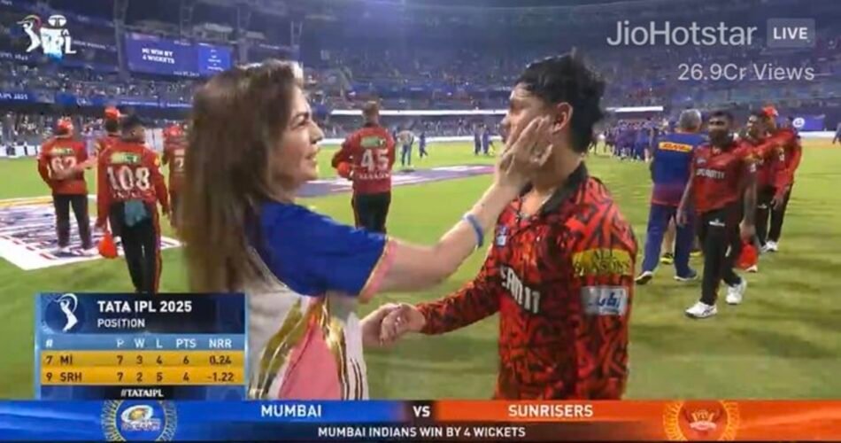 After Mumbai Indians’ victory over Sunrisers Hyderabad, there was a heartwarming reunion between MI owner Nita Ambani and former player Ishan Kishan at the Wankhede Stadium. Ishan, who had been with MI for seven seasons before joining Sunrisers, returned to Wankhede for the first time in rival colors. Despite a quiet outing with the bat, being stumped for just 2 runs, the emotional moment between Ishan and Nita Ambani showcased the bond between them.