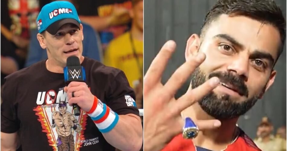 WWE legend John Cena recently broke the internet by sharing a picture of Indian cricket superstar Virat Kohli striking the wrestler’s iconic ‘You can’t see me’ pose. This gesture by Kohli came just days after Cena mimicked the same pose while showing off his T20 World Cup ring. The image was shared on Instagram by Cena, showcasing the mutual admiration between the two global icons.