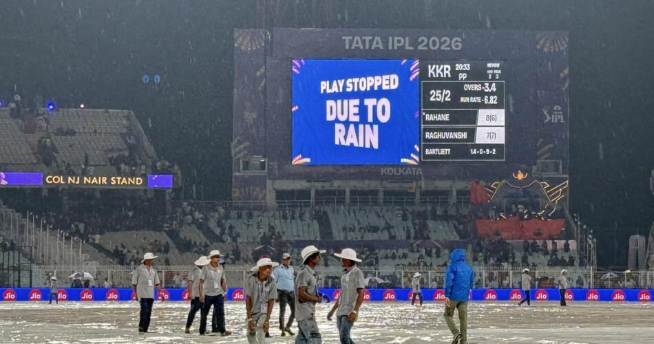 Despite the forecast for rain, KKR chose to bat first and was at 25 for two in 3.4 overs when the showers arrived, forcing play to be halted just 17 minutes into the game at Eden Gardens. Missing key players Varun Chakravarthy and Sunil Narine due to injuries, KKR added Rovman Powell and Navdeep Saini to strengthen the batting lineup.