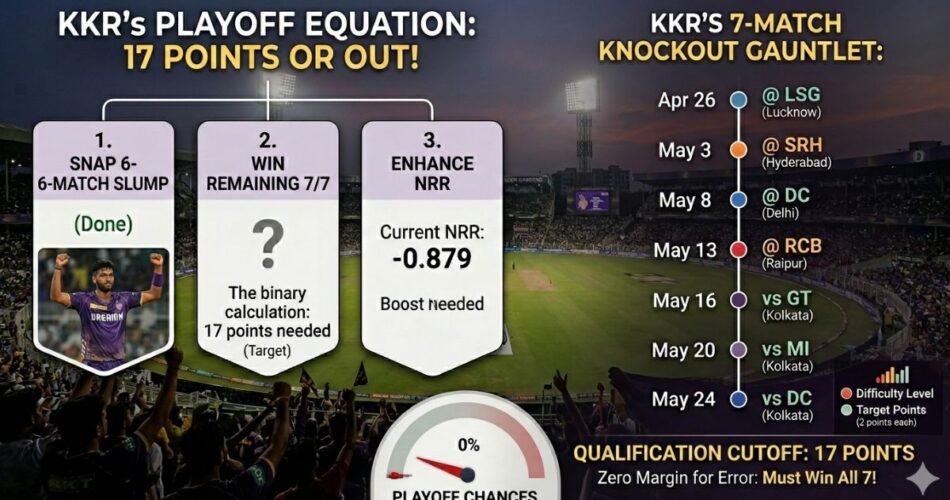 The recent 4-wicket victory over Rajasthan Royals has given Kolkata Knight Riders (KKR) a ray of hope in the challenging IPL 2026 season. With only 3 points from 7 matches, KKR’s path to the playoffs is now clear – they must win all 7 remaining matches to reach a maximum of 17 points. Historically, teams with 17 points have always made it to the Top 4. However, if they manage to win 6 out of 7 matches, they would need favorable results from other teams and a significant boost to their Net Run Rate. KKR’s fate is largely in their hands, but they have no room for error. They need to focus on winning matches by large margins to improve their negative NRR. Their upcoming matches will take them to various venues, including Lucknow, Hyderabad, and Delhi, where they will aim to turn their fortunes around. With Anukul Roy and Rinku Singh in form, KKR is determined to stage a “Great Escape” and secure a spot in the playoffs by treating the remaining matches as a seven-match knockout tournament.