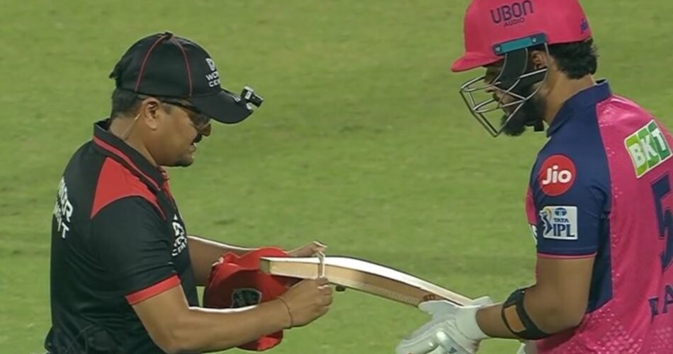 Riyan Parag stepped in for an injured Sanju Samson during Rajasthan’s chase of 189 against Delhi Capitals at the Arun Jaitley Stadium. However, he was halted by the on-field umpire as his bat did not pass the gauge test, a new rule implemented by the BCCI in IPL 2025 to ensure fair play between bat and ball. This rule requires every bat to undergo inspection before a batter takes guard. Parag was seen discussing with the match official before being compelled to change his equipment.